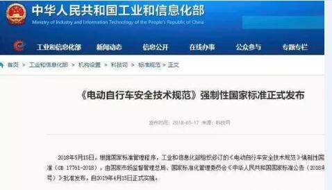 新国标是今年5月份由国家市场监督管理总局、国家标准化管理委员会及工信部等四部门批准发布的《电动自行车安全技术规范》国家标准。新修订的《规范》废除了长达19年的旧规,调整完善了电动自行车最高车速、整车质量、脚踏骑行能力等技术要求,意在保证大众出行安全。