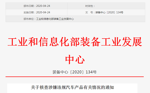 关于核查涉嫌违规汽车产品有关情况的通知(装备中心〔2020〕134号)
