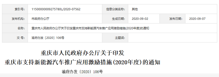 渝府办发〔2020〕106号_《重庆市支持新能源汽车推广应用激励措施(2020年度)的通知》印发