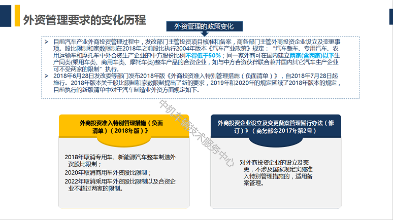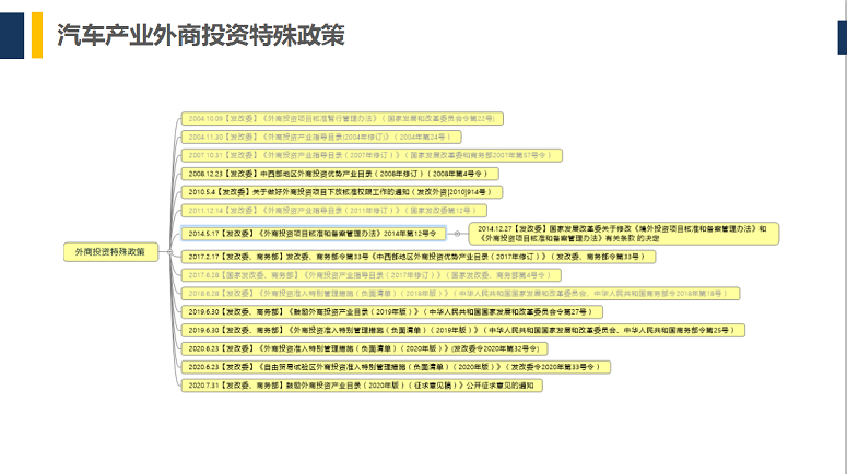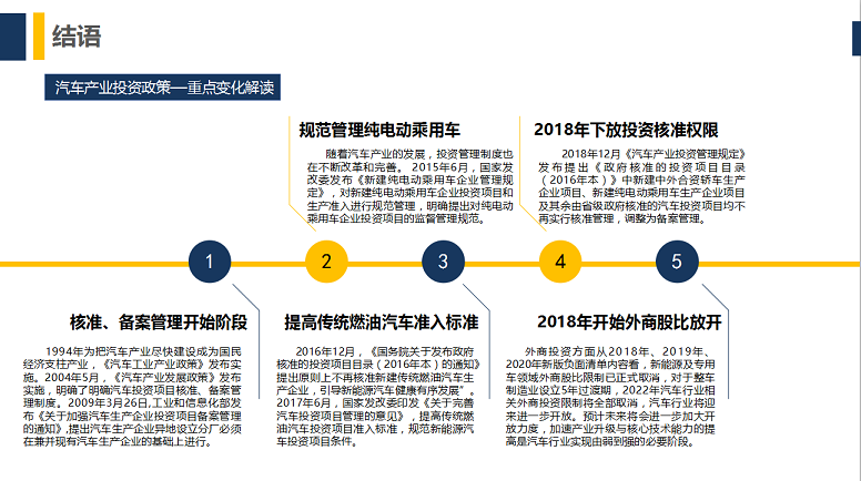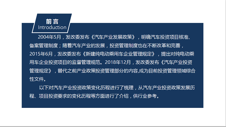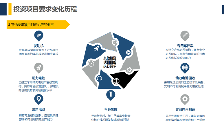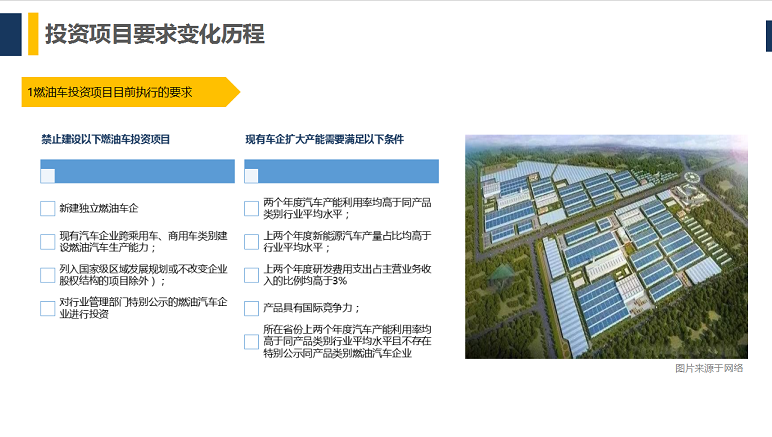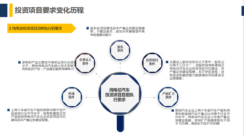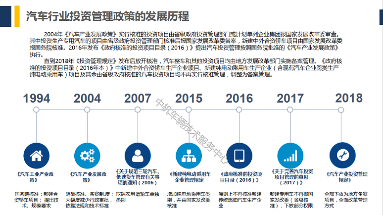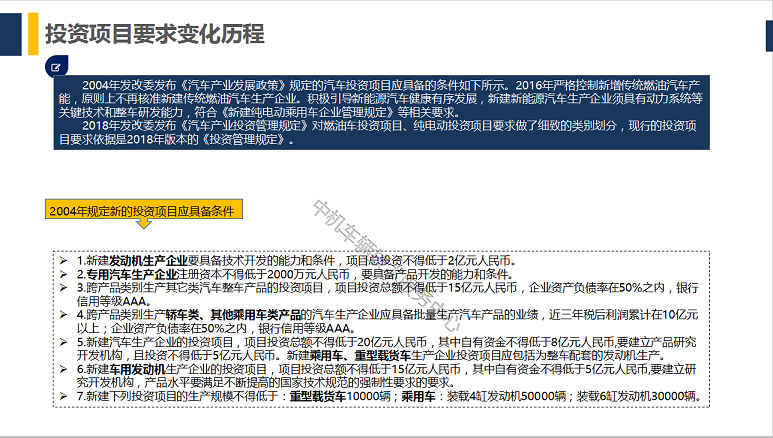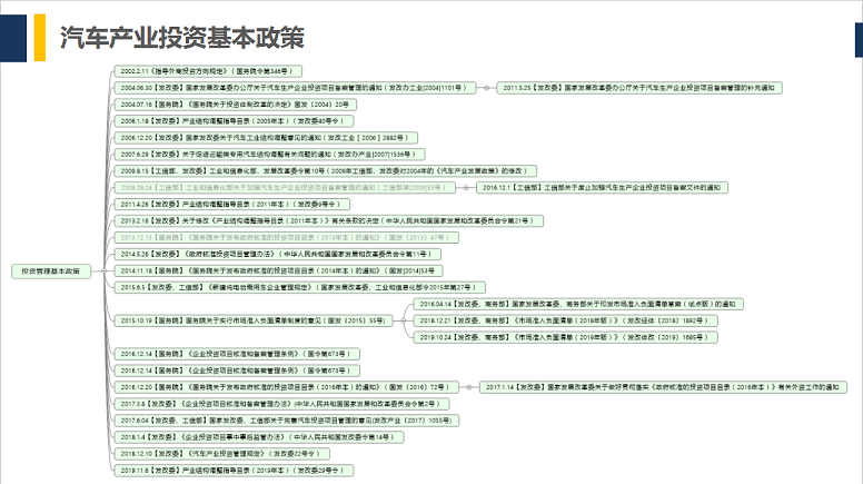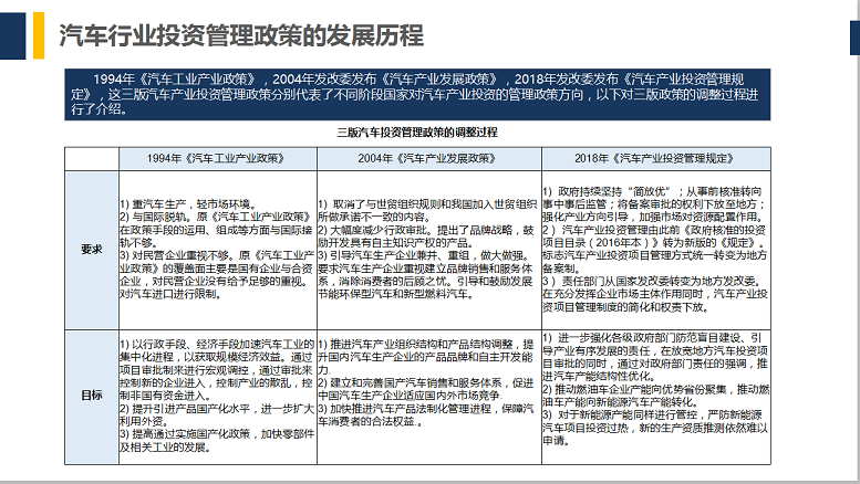 2004年,发改委发布《汽车产业发展政策》,规定了汽车投资项目应具备的条件,明确了汽车投资项目核准、备案管理制度;随着汽车产业的发展,投资管理制度也在不断改革和完善,2015年6月,发改委发布《新建纯电动乘用车企业管理规定》,提出对纯电动乘用车企业投资项目的监督管理规范;2016年严格控制新增传统燃油汽车产能,原则上不再核准新建传统燃油汽车生产企业。积极引导新能源汽车健康有序发展,新建新能源汽车生产企业须具有动力系统等关键技术和整车研发能力,符合《新建纯电动乘用车企业管理规定》等相关要求;2018年12月,发改委发布《汽车产业投资管理规定》,替代之前产业政策投资管理部分的内容,对燃油车投资项目、纯电动投资项目要求做了细致的类别划分, 成为目前汽车投资管理领域综合性文件。
