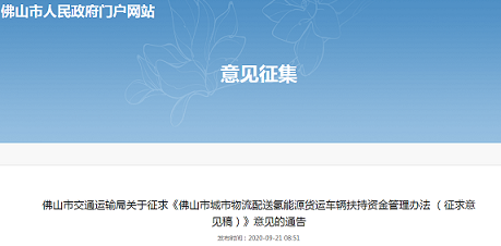 佛山市交通运输局关于征求《佛山市城市物流配送氢能源货运车辆扶持资金管理办法 (征求意见稿)》意见的通告