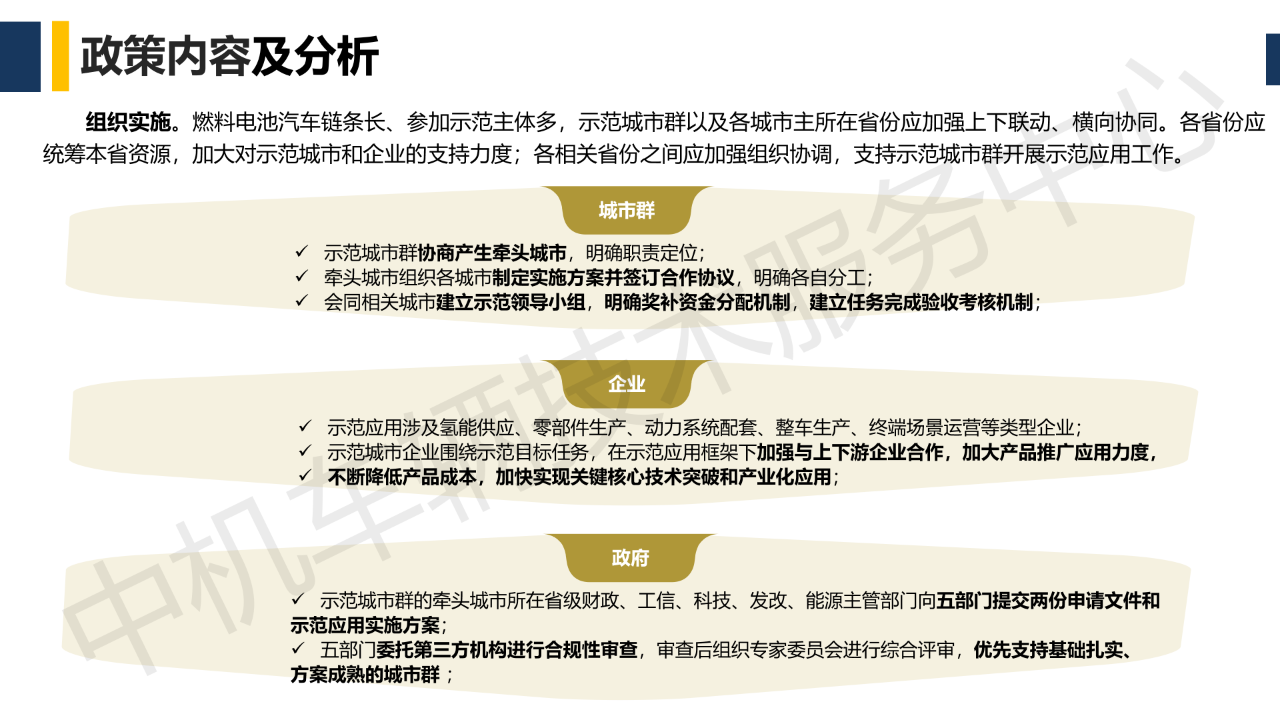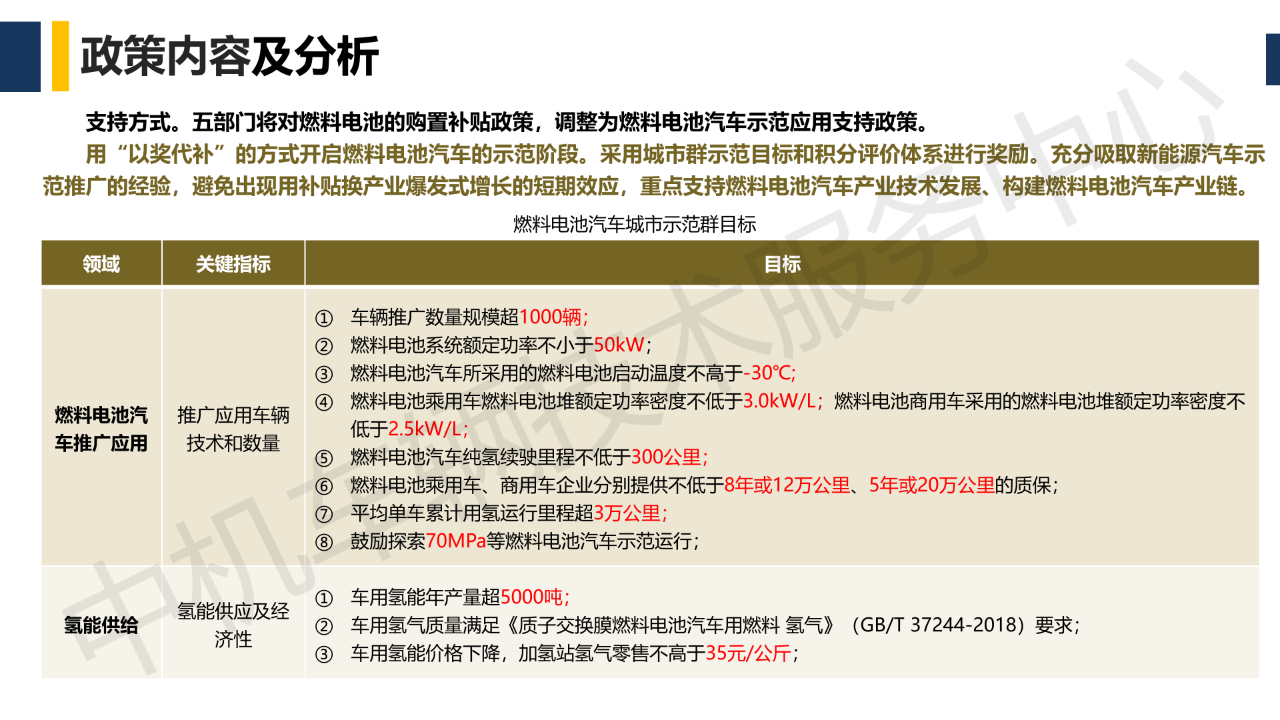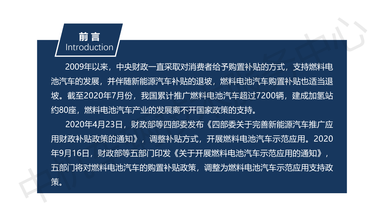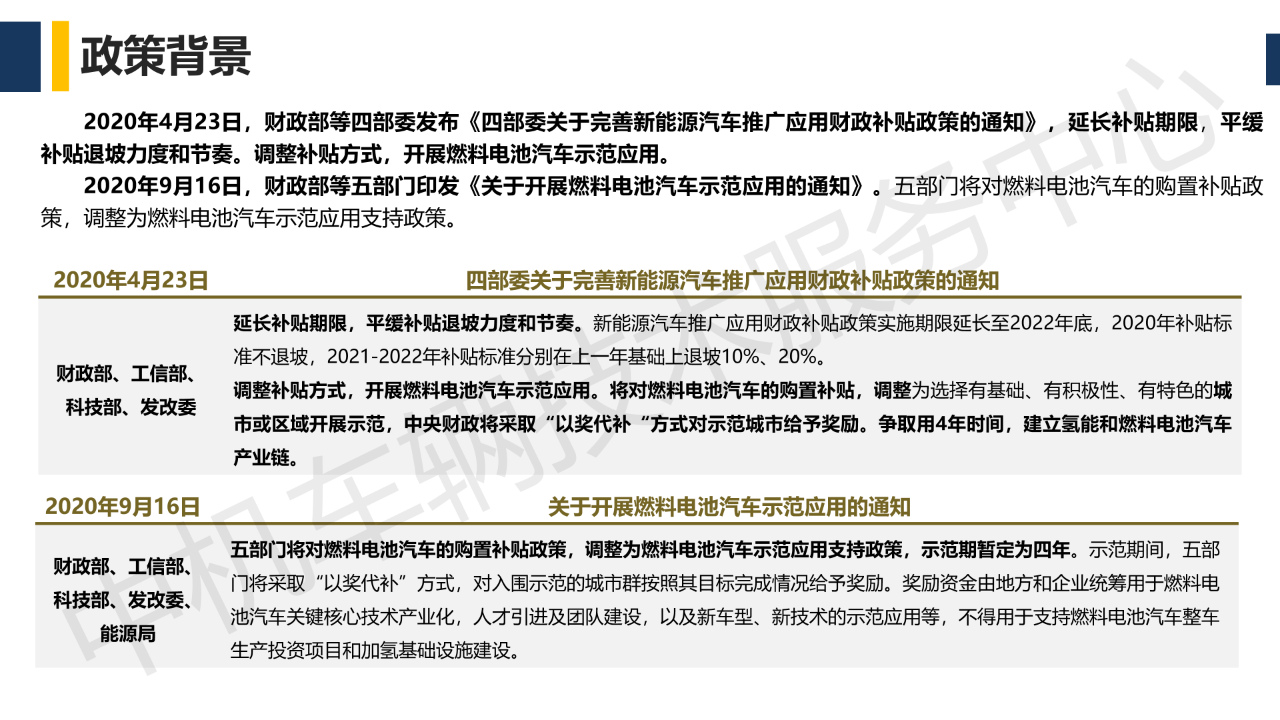 2020年4月23日,财政部等四部委发布《四部委关于完善新能源汽车推广应用财政补贴政策的通知》,调整补贴方式,开展燃料电池汽车示范应用。2020年9月16日,财政部等五部门印发《关于开展燃料电池汽车示范应用的通知》,五部门将对燃料电池汽车的购置补贴政策,调整为燃料电池汽车示范应用支持政策。示范期暂定为四年。示范期间,五部门将采取“以奖代补”方式,对入围示范的城市群按照其目标完成情况给予奖励。奖励资金由地方和企业统筹用于燃料电池汽车关键核心技术产业化,人才引进及团队建设,以及新车型、新技术的示范应用等,不得用于支持燃料电池汽车整车生产投资项目和加氢基础设施建设。
