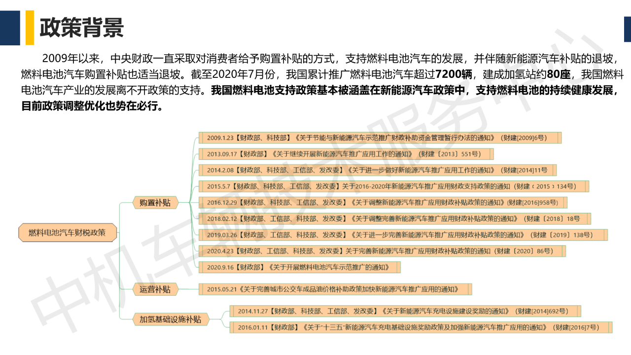 2009年以来,中央财政一直采取对消费者给予购置补贴的方式,支持燃料电池汽车的发展,并伴随新能源汽车补贴的退坡,燃料电池汽车购置补贴也适当退坡。截至2020年7月份,我国累计推广燃料电池汽车超过7200辆,建成加氢站约80座,燃料电池汽车产业的发展离不开国家政策的支持。