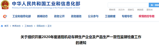 为督促企业落实主体责任,提高车辆产品的安全性能和节能水平,加强汽车安全管理,工业和信息化部装备工业一司决定近期组织开展2020年度道路机动车辆生产企业及产品生产一致性监督检查工作。现将有关事项通知如下: