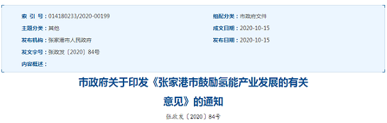 市政府关于印发《张家港市鼓励氢能产业发展的有关意见》的通知(张政发〔2020〕84号)
