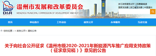 温州市发改委发布《温州市级2020-2021年新能源汽车推广应用支持政策(征求意见稿)》