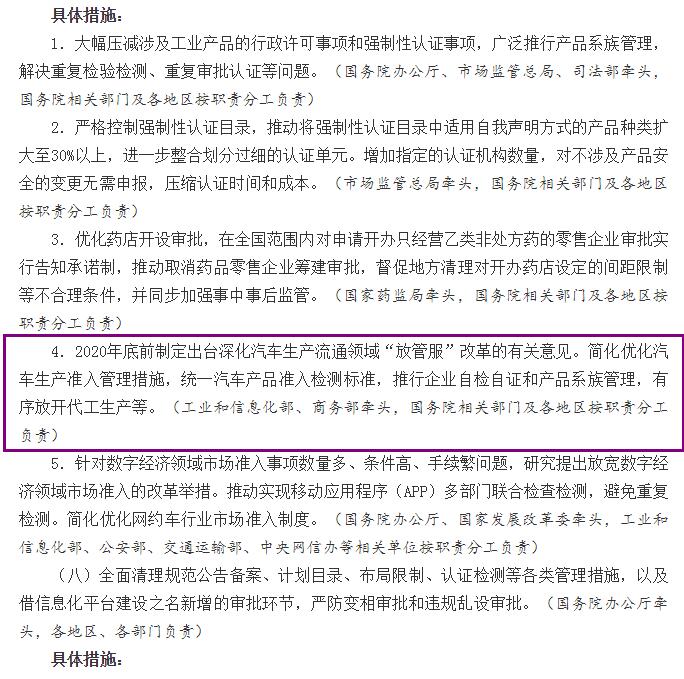 《全国深化 “放管服”改革优化营商环境电视电话会议重点任务分工方案》印发,简化汽车准入措施