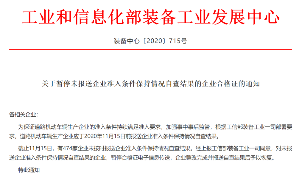 截止11月15日,有474家企业未按时报送企业准入条件保持情况自查结果。经上报工信部装备工业一司同意,对未报送企业准入条件保持情况自查结果的企业,暂停合格证电子信息传送,企业整改完成并报送自查结果后予以恢复。”